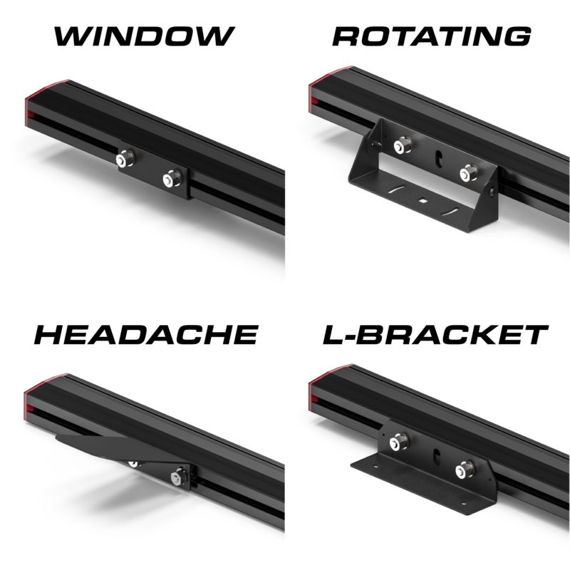 - Four mounting options L-bracket, rotating, headliner, window mount