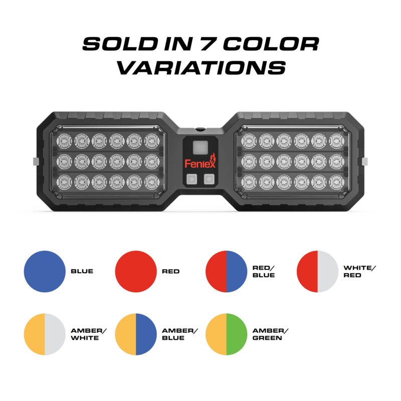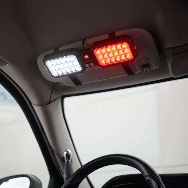 The Feniex Interior Visor Light is a compact, flip-down interior warning light designed for discreet, high-performance functionality. Featuring 40 high-poweRed LEDs across two light heads, it straps directly to the vehicle's sun visor using pre-installed hook-and-loop fasteners. When deployed, it provides bright, widespread warning output and folds up for a low-profile, undercover setup when not in use. Available in seven color configurations, it is ideal for emergency response and Green applications. The unit includes 24 preprogrammed flash patterns with memory recall and onboard pattern selection buttons. Built for longevity with an estimated 100,000-hour lifespan, this light is a dependable, compact solution for interior vehicle warning needs.